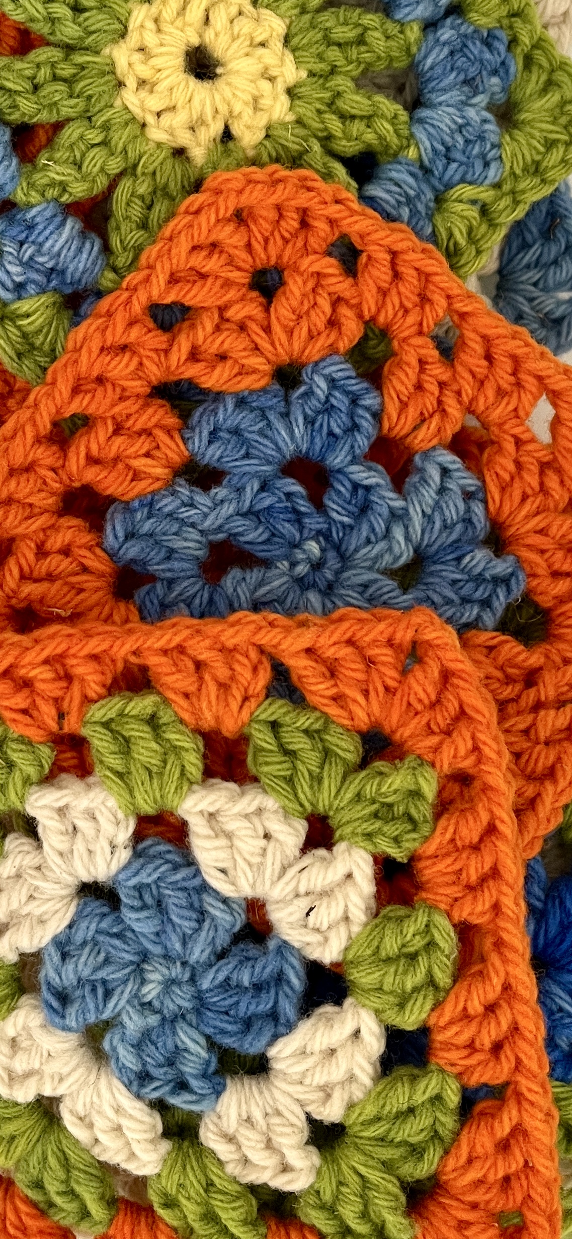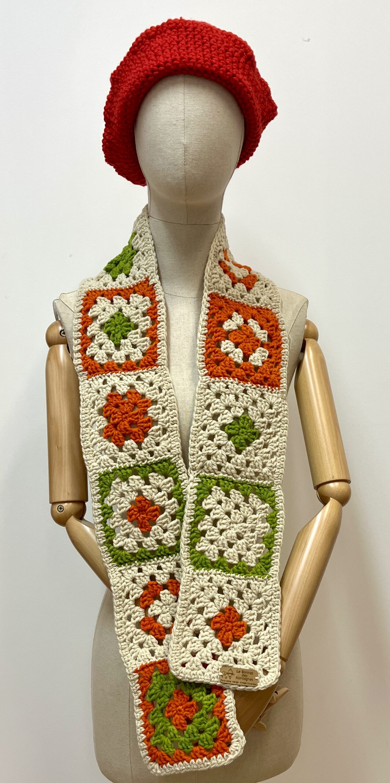 Confectionnée au crochet selon la tradition des carrés de grand-mère de la mode des années 70, chacune des écharpes granny présentées ici est une pièce unique.
