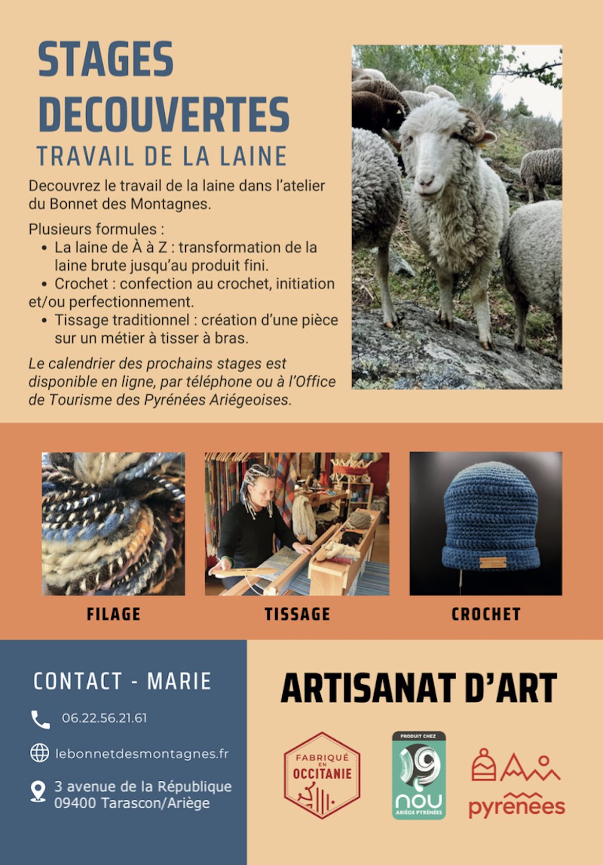 Tous les stages se déroulent à l’atelier Le Bonnet des Montagnes, 3 avenue de la République, 09400 Tarascon/Ariège .